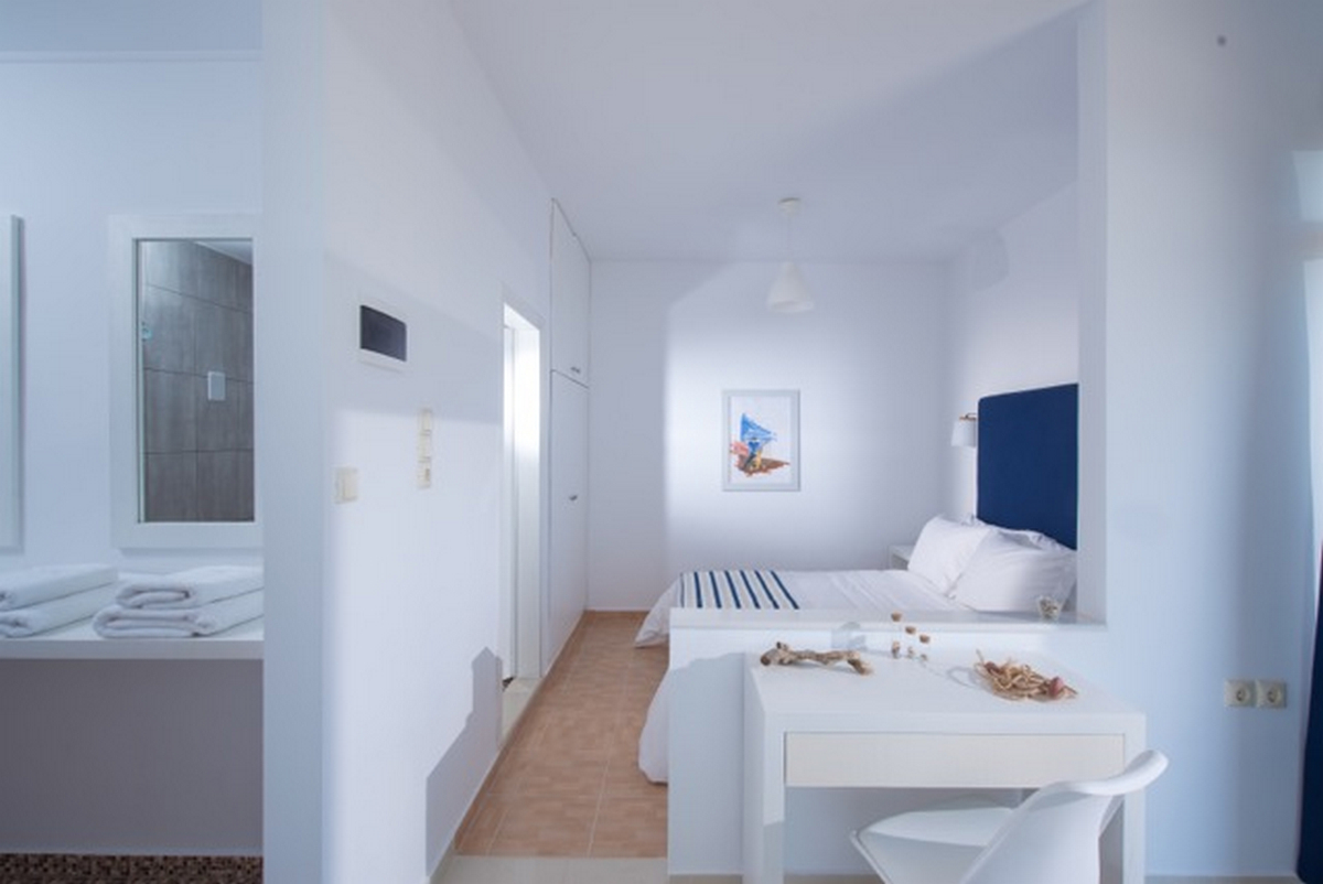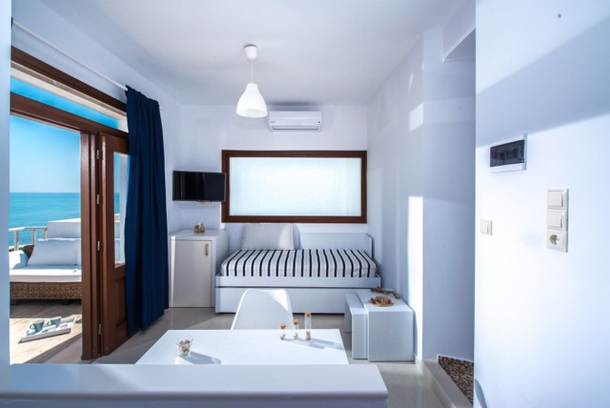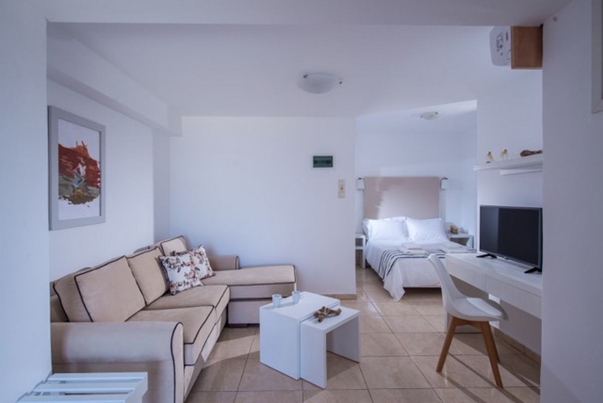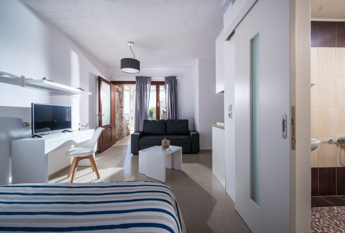 Perfect for couples or solo travelers, our Deluxe Studio Suite offers an inviting open-plan layout with a comfortable double bed, modern furnishings, and a fully equipped kitchenette. Enjoy your morning coffee on your private balcony and feel the gentle Cretan breeze as you start your day.